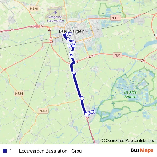 The first stop of the 1 bus route is Grou, Parkstraat and the last stop is Leeuwarden, Busstation. 1 (Leeuwarden Busstation - Grou) is operational during täglich.