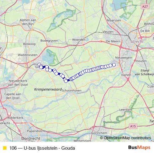 The first stop of the 106 bus route is Gouda, Station and the last stop is Ijsselstein, Binnenstad. 106 (U-bus Ijsselstein - Gouda) is operational during täglich.