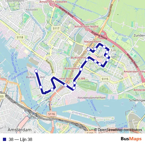 The first stop of the 38 bus route is Amsterdam, Distelweg and the last stop is Amsterdam, Station Noord. 38 (Lijn 38) is operational during täglich.