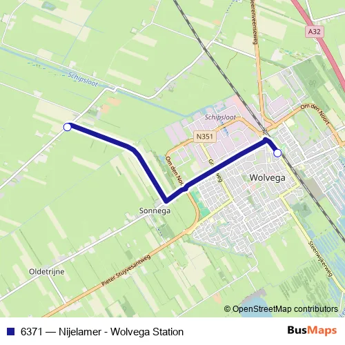 The first stop of the 6371 bus route is Nijelamer, Schipslootweg and the last stop is Wolvega, Station. 6371 (Nijelamer - Wolvega Station) is operational during täglich.