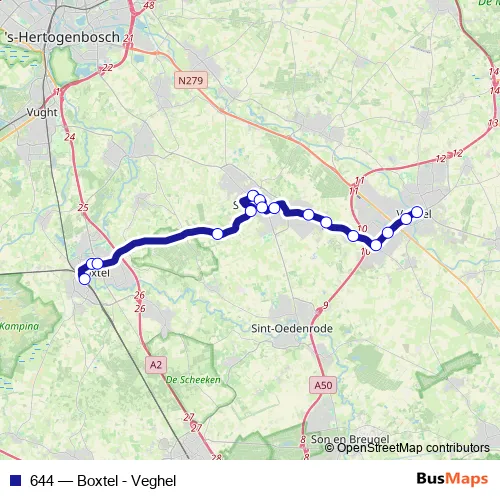 The first stop of the 644 bus route is Boxtel, Station and the last stop is Veghel, Busstation. 644 (Boxtel - Veghel) is operational during an Werktagen.