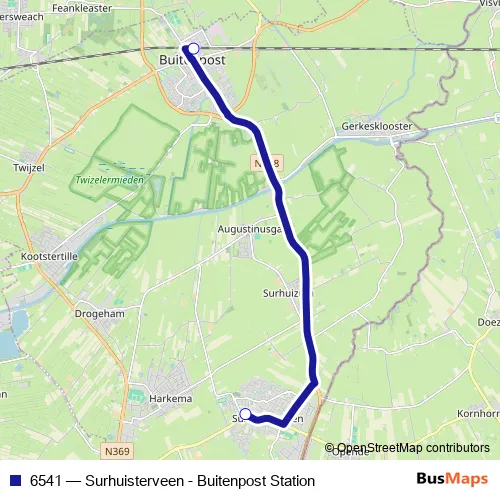 The first stop of the 6541 bus route is Buitenpost, Station and the last stop is Surhuisterveen, Torenplein. 6541 (Surhuisterveen - Buitenpost Station) is operational during täglich.