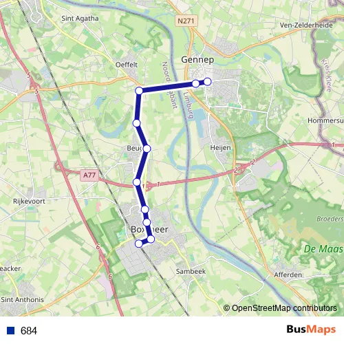 The first stop of the 684 metro route is Boxmeer, Station (Bus) and the last stop is Gennep, Busstation. 684 is operational during an Werktagen.
