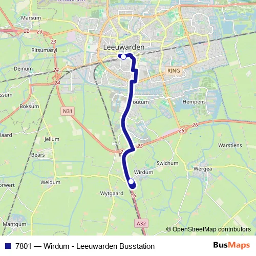 Leeuwarden, Busstation (Perron A) – Wirdum (Fr), Wirdum Rijksweg