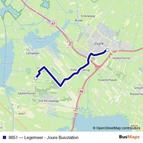 The first stop of the 8651 bus route is Legemeer, Legemeer and the last stop is Joure, Busstation (Perron A). 8651 (Legemeer - Joure Busstation) is operational during täglich.