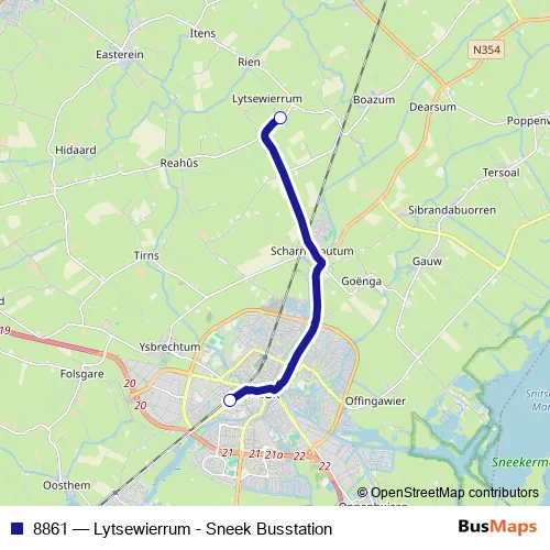 The first stop of the 8861 bus route is Lytsewierrum, Lytsewierrum and the last stop is Sneek, Busstation (Perron F). 8861 (Lytsewierrum - Sneek Busstation) is operational during täglich.