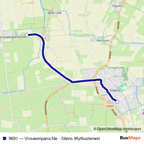 Click here to view the nearest 9691 - Vrouwenparochie - Stiens Wythusterwei bus stop.