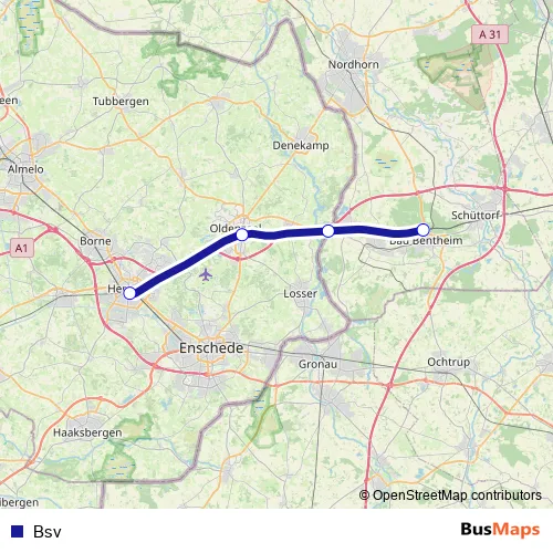 The first stop of the Bsv rail route is Bad Bentheim and the last stop is