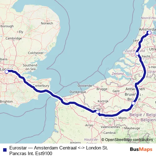 The first stop of the Eurostar rail route is Amsterdam Centraal and the last stop is London St. Pancras Int.. Eurostar (Amsterdam Centraal <-> London St. Pancras Int. Est9100) is operational during täglich.