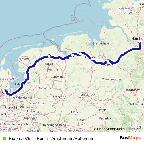 The first stop of the Flixbus 075 bus route is Amsterdam Sloterdijk and the last stop is Hamburg central bus station. Flixbus 075 (Berlin - Amsterdam/Rotterdam) is operational during täglich.