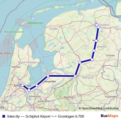 Amsterdam Centraal. Intercity (Schiphol Airport <-> Groningen Ic700) is operational during täglich.