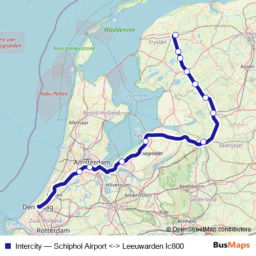 The first stop of the Intercity rail route is Schiphol Airport and the last stop is Heerenveen. Intercity (Schiphol Airport <-> Leeuwarden Ic800) is operational during täglich.