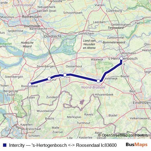 The first stop of the Intercity rail route is 's-Hertogenbosch and the last stop is Roosendaal. Intercity ('s-Hertogenbosch <-> Roosendaal Ic83600) is operational during täglich.