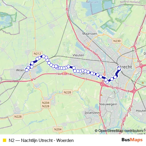 The first stop of the N2 bus route is Utrecht, Oorsprongpark and the last stop is Woerden, Station. N2 (Nachtlijn Utrecht - Woerden) is operational during am Wochenende.