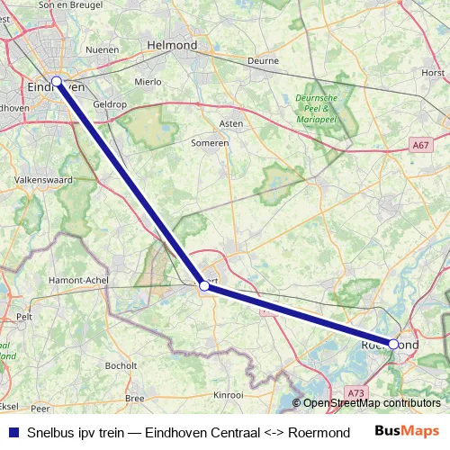 The first stop of the Snelbus ipv trein bus route is [Roermond] Busstation, Stationsplein halte I and the last stop is [Eindhoven Centraal] Taxistandplaats, Kennedyplein. Snelbus ipv trein (Eindhoven Centraal <-> Roermond) is operational during am Wochenende.