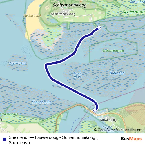 The first stop of the Sneldienst ferry route is Lauwersoog and the last stop is Schiermonnikoog. Sneldienst (Lauwersoog - Schiermonnikoog (Sneldienst)) is operational during täglich.