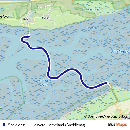 The first stop of the Sneldienst ferry route is Ameland and the last stop is Holwert. Sneldienst (Holwerd - Ameland (Sneldienst)) is operational during täglich.