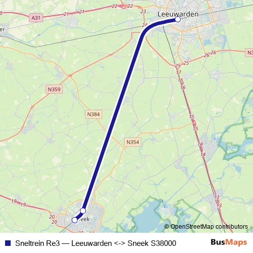 The first stop of the Sneltrein Re3 rail route is Leeuwarden and the last stop is Sneek. Sneltrein Re3 (Leeuwarden <-> Sneek S38000) is operational during an Werktagen.