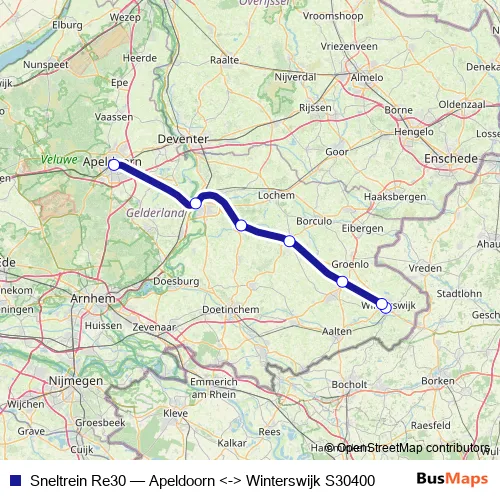 The first stop of the Sneltrein Re30 rail route is Winterswijk and the last stop is Apeldoorn. Sneltrein Re30 (Apeldoorn <-> Winterswijk S30400) is operational during täglich.