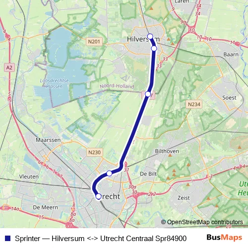 The first stop of the Sprinter rail route is Hilversum and the last stop is Utrecht Centraal. Sprinter (Hilversum <-> Utrecht Centraal Spr84900) is operational during täglich.