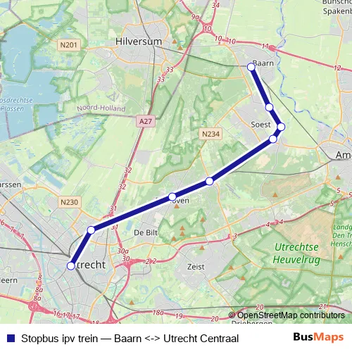 The first stop of the Stopbus ipv trein bus route is [Baarn] OHR - Uitstaphalte OV halte Stationsplein and the last stop is [Utrecht Centraal] Halte Jaarbeursplein bushalte G. Stopbus ipv trein (Baarn <-> Utrecht Centraal) is operational during am Wochenende.