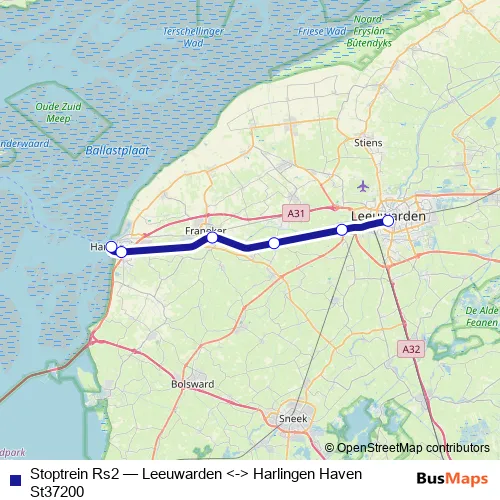 The first stop of the Stoptrein Rs2 rail route is Harlingen Haven and the last stop is Leeuwarden. Stoptrein Rs2 (Leeuwarden <-> Harlingen Haven St37200) is operational during täglich.