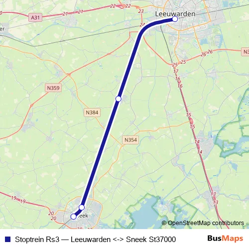 The first stop of the Stoptrein Rs3 rail route is Sneek and the last stop is Leeuwarden. Stoptrein Rs3 (Leeuwarden <-> Sneek St37000) is operational during täglich.