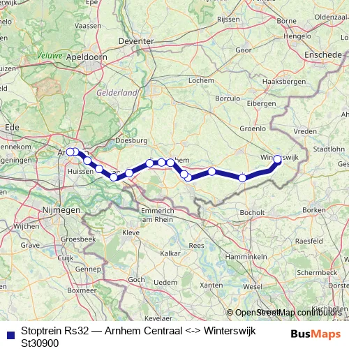 The first stop of the Stoptrein Rs32 rail route is Winterswijk and the last stop is Arnhem Centraal. Stoptrein Rs32 (Arnhem Centraal <-> Winterswijk St30900) is operational during täglich.