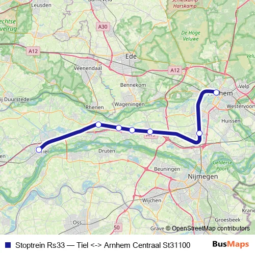 The first stop of the Stoptrein Rs33 rail route is Tiel and the last stop is Arnhem Centraal. Stoptrein Rs33 (Tiel <-> Arnhem Centraal St31100) is operational during täglich.
