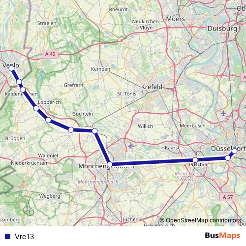 The first stop of the Vre13 bus route is Düsseldorf Hbf and the last stop is Venlo. Vre13 is operational during täglich.