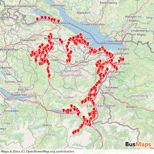 Bus Ostschweiz operates in the following cities: Muenchwilen, Lustenau, Sargans, Arbon, Vaduz, Altstatten, Hohenems, Schaan, Wil, Amriswil, Appenzell, Balgach, Balzers, Dornbirn, Gaissau, Gamprin, Gottlieben, Herisau, Hohentannen, Koblach, Lichtensteig, Quarten, Romanshorn, Ruggell, Weinfelden.
