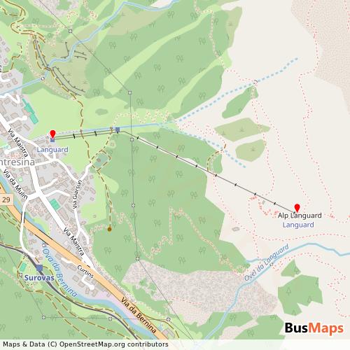 Pontresina-Alp Languard, based in Pontresina, Grisons, Switzerland, offers a reliable and comprehensive network of public transport services, including Cable car. Our platform provides detailed and up-to-date information on routes, schedules, stops, and arrivals for all services operated by Pontresina-Alp Languard. Whether you're planning your daily commute or exploring the city, our tools help you find the nearest stop and the best route to your destination.