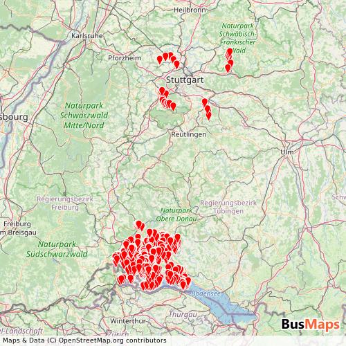 VHB (Fplan VHB Sbp) operates in the following cities: Thayngen, Kreuzlingen, Stockach, Muhlingen, Radolfzell, Steckborn, Rot, Steisslingen, Tuttlingen, Bodman-Ludwigshafen, Eigeltingen, Konstanz, Rielasingen-Worblingen, Singen, Engen, Diessenhofen, Frauenfeld, Muhlhausen-Ehingen, Schaffhausen, Allensbach, Moos, Boeblingen, Ohningen, Orsingen-Nenzingen, Volkertshausen, Gaienhofen, Litzelstetten, Nurtingen, Reichenau, Rudersberg, Stein am Rhein, Stuttgart, Tengen.