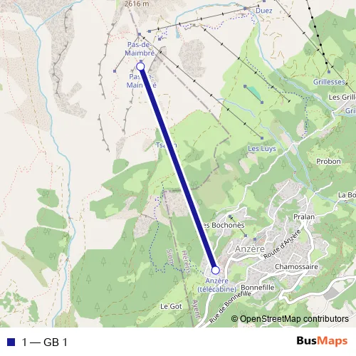 The first stop of the 1 cable-car route is Anzère (télécabine) and the last stop is Pas-de-Maimbré. 1 (GB 1) is operational during täglich.