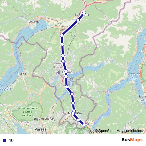 The first stop of the 10 rail route is Bellinzona and the last stop is Chiasso. 10 is operational during am Wochenende.