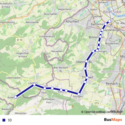 The first stop of the 10 bus route is Basel, Heuwaage and the last stop is Rodersdorf, Station. 10 is operational during täglich.