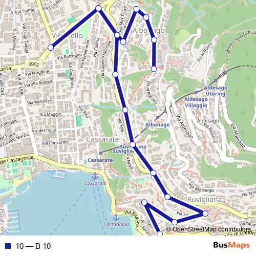 The first stop of the 10 bus route is Albonago, Paese and the last stop is Castagnola, Capolinea. 10 (B 10) is operational during täglich.