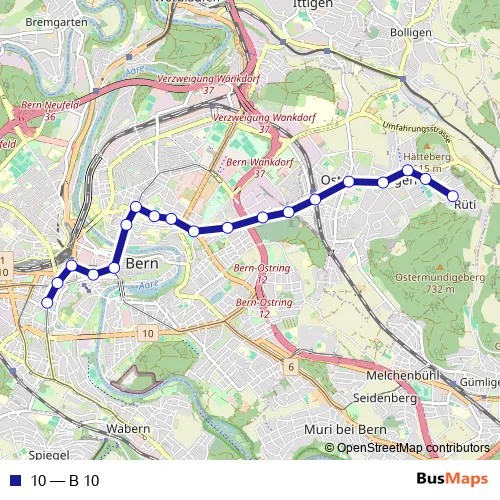 The first stop of the 10 bus route is Bern, Monbijou and the last stop is Ostermundigen, Rüti. 10 (B 10) is operational during täglich.