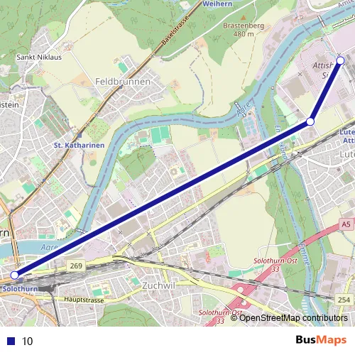 The first stop of the 10 bus route is Luterbach, Attisholzstrasse and the last stop is Solothurn, Hauptbahnhof. 10 is operational during an Werktagen.