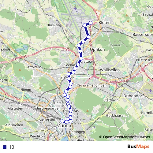 The first stop of the 10 tram route is Zürich Flughafen, Fracht and the last stop is Zürich, Bahnhofplatz/Hb. 10 is operational during täglich.