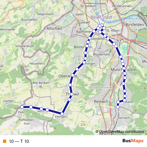 The first stop of the 10 tram route is Dornach, Bahnhof and the last stop is Flüh, Station. 10 (T 10) is operational during täglich.