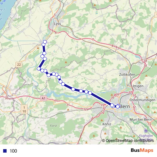 The first stop of the 100 bus route is Bern, Hauptbahnhof and the last stop is Aarberg, Post/Bahnhof. 100 is operational during täglich.
