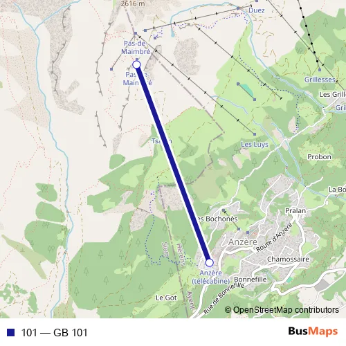The first stop of the 101 cable-car route is Anzère (télécabine) and the last stop is Pas-de-Maimbré. 101 (GB 101) is operational during täglich.
