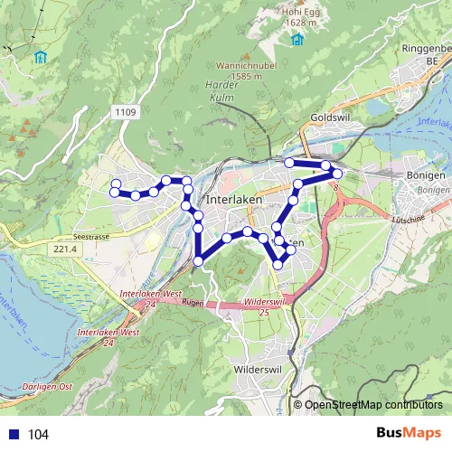 The first stop of the 104 bus route is Unterseen, Stadtfeld and the last stop is Interlaken Ost, Bahnhof. 104 is operational during täglich.