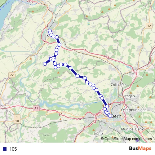 See why over 2 million users trust and consider busmaps.com as the best public transport website. busmaps gives you Bern Buses suggested routes, real-time bus tracker, line route maps in Bern, and helps to find the closest 105 bus stops near you. No internet available? Download an offline PDF map and bus schedule for the 105 bus to take on your trip.