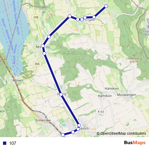 The first stop of the 107 bus route is Schongau, Oberschongau and the last stop is Hitzkirch, Bahnhof. 107 is operational during täglich.