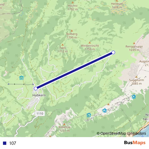 The first stop of the 107 bus route is Habkern, Zäundli and the last stop is Habkern,Lombachalp-Roteschwand. 107 is operational during täglich.