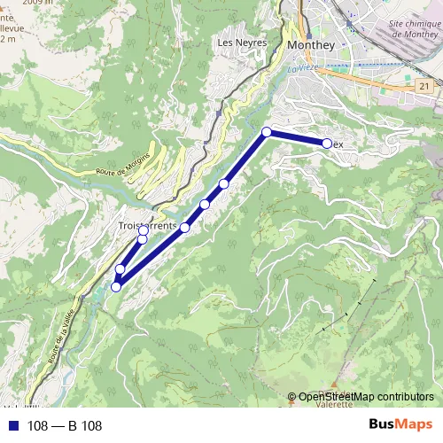 The first stop of the 108 bus route is Choëx, école and the last stop is Troistorrents, gare. 108 (B 108) is operational during täglich.