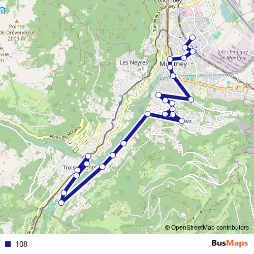 The first stop of the 108 bus route is Monthey, Reposieux and the last stop is Troistorrents, gare. 108 is operational during täglich.