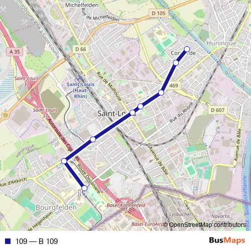 The first stop of the 109 bus route is Huningue, Concorde and the last stop is St-Louis, Saint-Exupéry. 109 (B 109) is operational during an Werktagen.